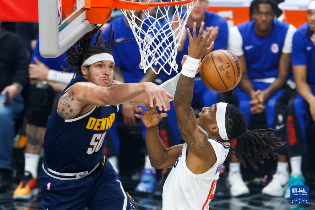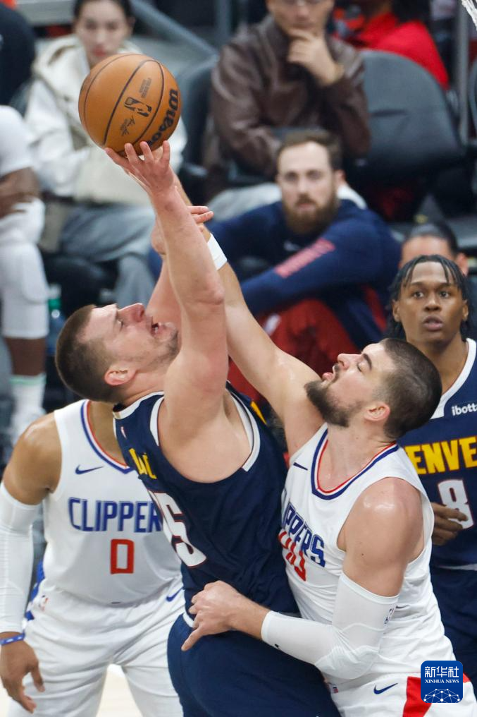 4月4日,掘金队球员尼古拉·约基奇(左)在快船队球员伊维察·祖巴茨的防守下投篮。新华社发(赵汉荣摄)