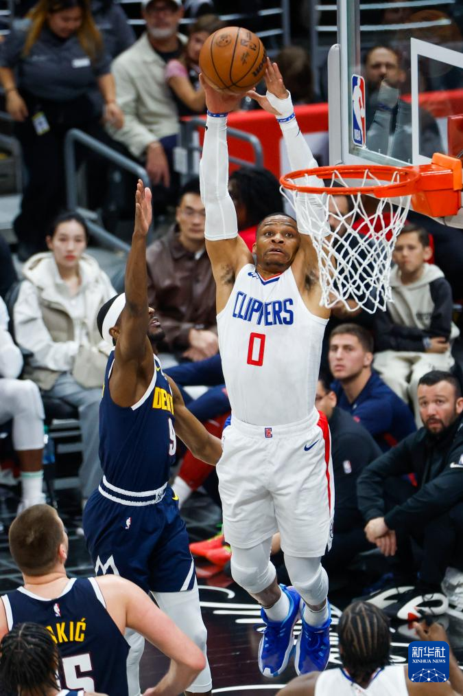 4月4日,快船队球员拉塞尔·威斯布鲁克(右)在比赛中上篮。新华社发(赵汉荣摄)