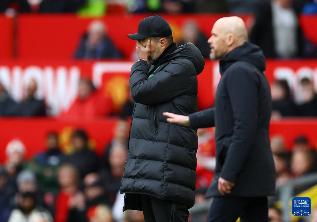 4月7日,利物浦队主教练克洛普(左)与曼联队主教练滕·哈格在比赛中。新华社/路透
