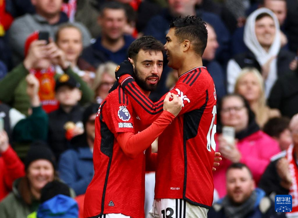 4月7日,曼联队球员费尔南德斯(左)进球后与队友卡塞米罗庆祝。新华社/路透
