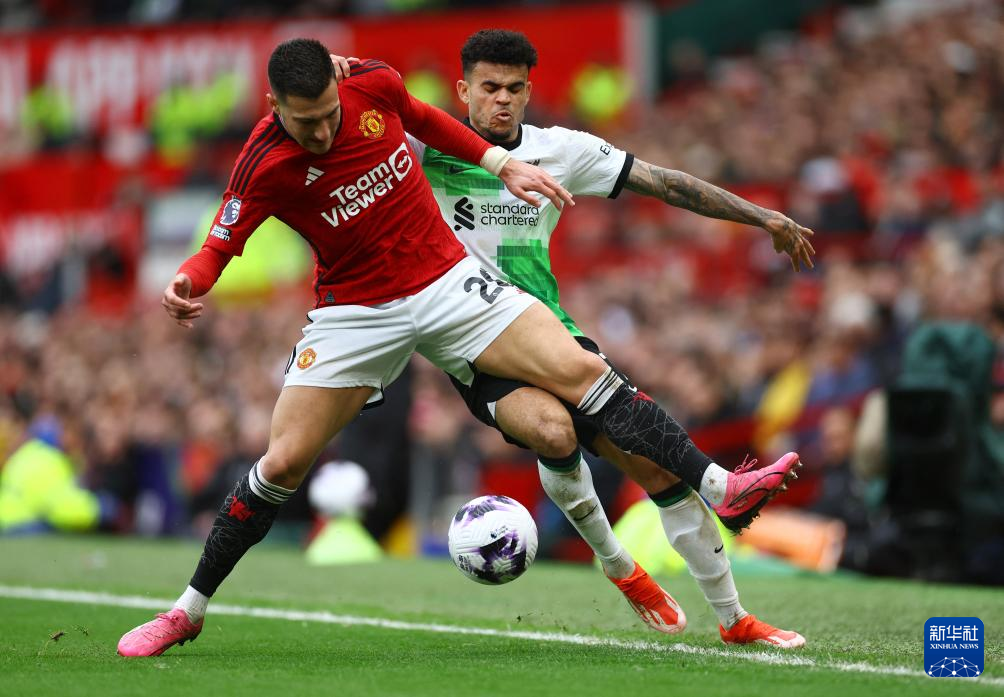 4月7日,曼联队球员达洛特(左)与利物浦队球员迪亚斯在比赛中拼抢。新华社/路透