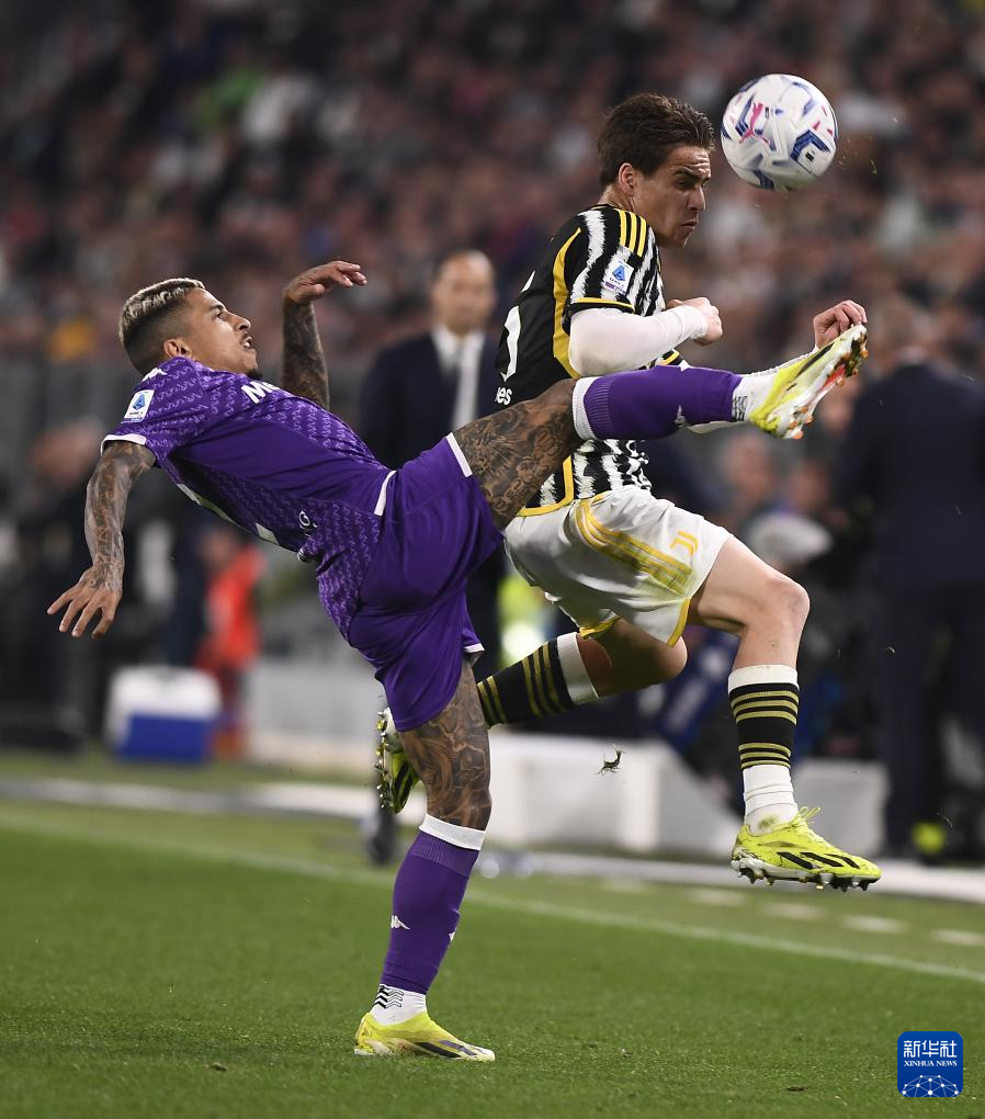 4月7日,尤文图斯队球员加蒂(前右)与佛罗伦萨队球员恩佐拉(前左)在比赛中拼抢。新华社发(费代里科·塔尔迪托摄)
