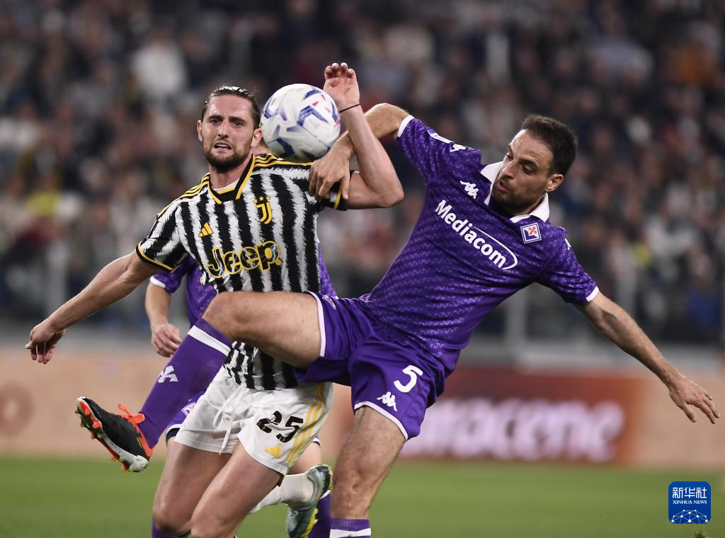 4月7日,尤文图斯队球员拉比奥(左)与佛罗伦萨队球员博纳文图拉在比赛中拼抢。新华社发(费代里科·塔尔迪托摄)