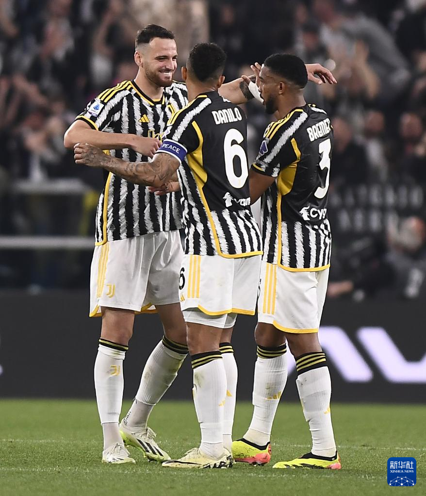 4月7日,尤文图斯队球员加蒂(左)在比赛后与队友庆祝。新华社发(费代里科·塔尔迪托摄)