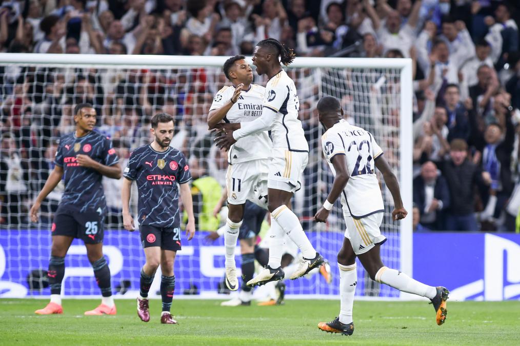 当天比赛第2分钟,贝尔纳多·席尔瓦主罚的直接任意球擦着门柱入网,为曼城早早取得领先。皇马随后连入两球反超比分,第12分钟,卡马文加禁区外远射,皮球打在曼城后卫迪亚斯腿上折射入网,两分钟后,罗德里戈在一次反击中带球长驱直入,冷静推射得分,将比分改写为2:1。