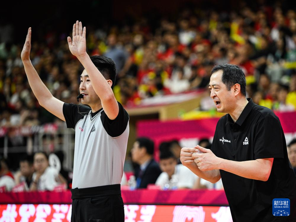 4月16日,内蒙古农信队主教练杨赞(右)在比赛中和裁判交流。新华社记者 王曦 摄