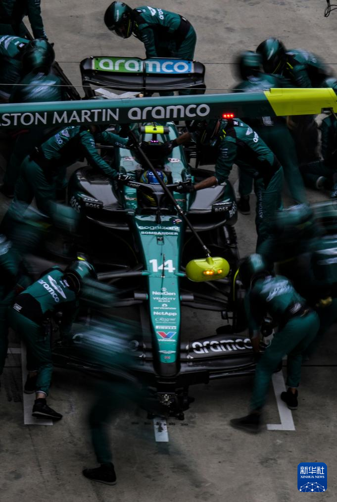 4月21日,阿斯顿·马丁车队工作人员在维修站为西班牙车手阿隆索更换轮胎。阿隆索最终获得第七名。新华社记者 夏一方 摄