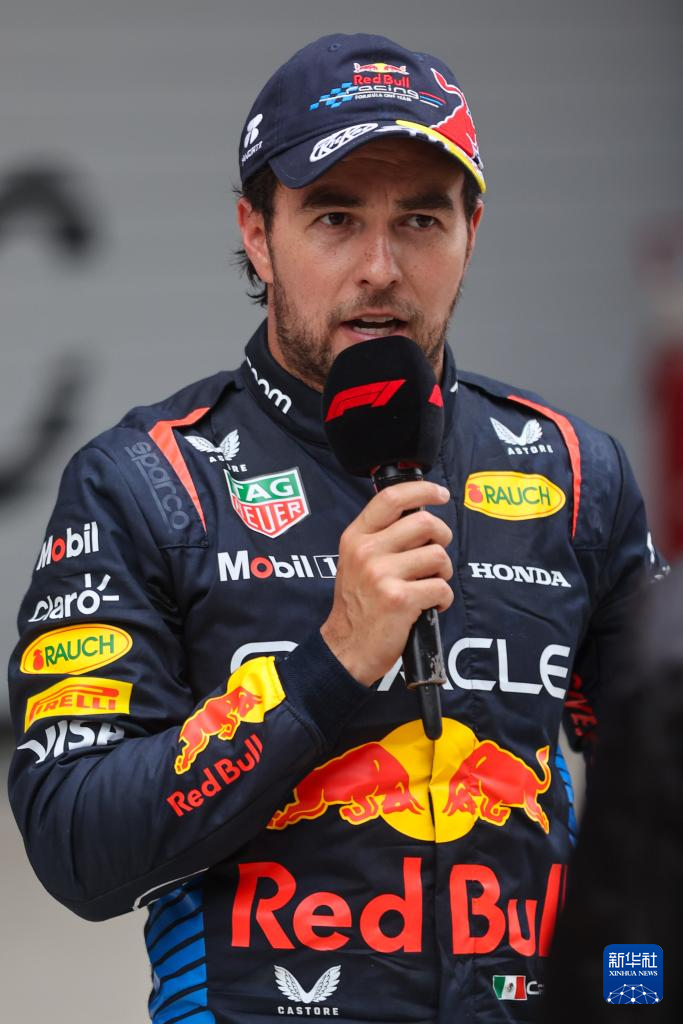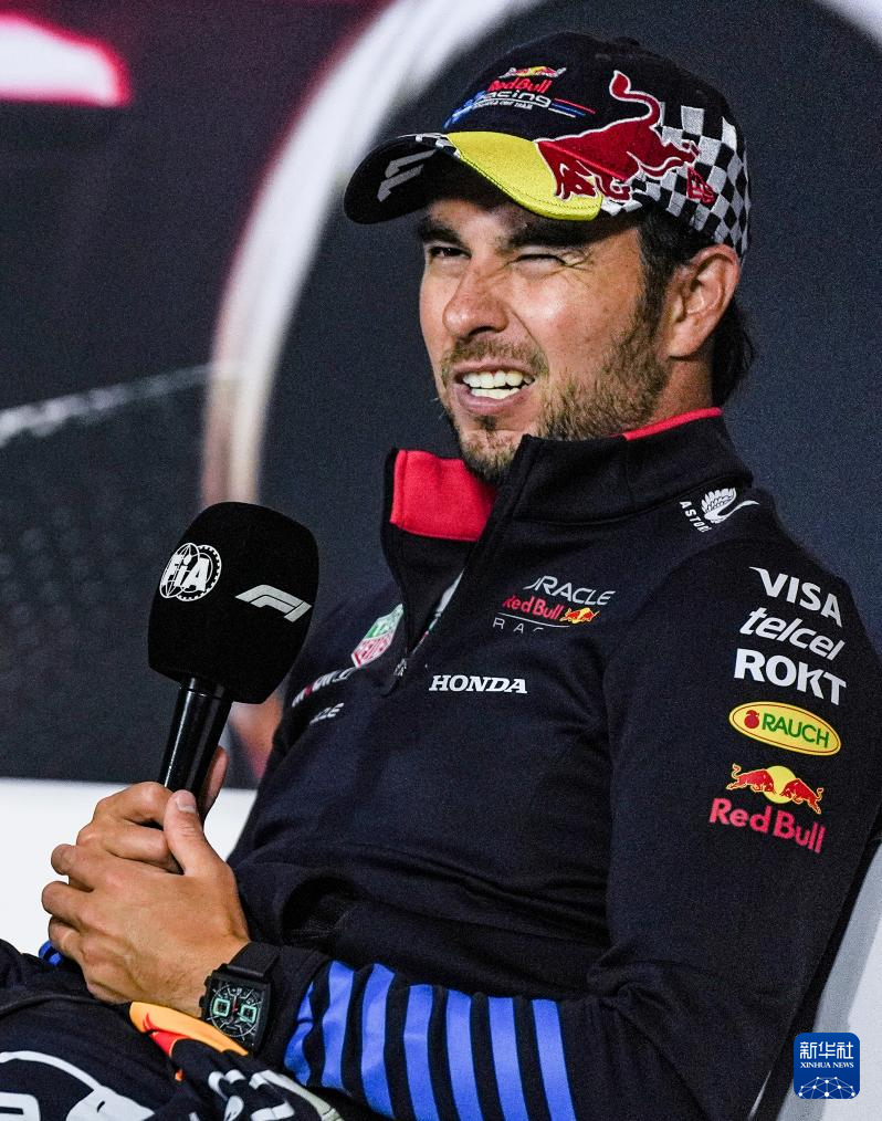 4月21日,红牛车队墨西哥车手佩雷兹在赛后访谈中。新华社记者 夏一方 摄