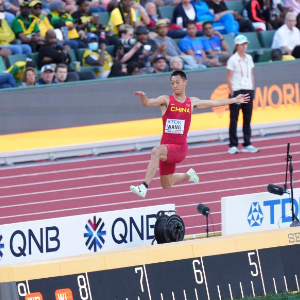 2022年7月16日,在美国俄勒冈州尤金市举行的2022世界田径锦标赛男子跳远决赛中,中国选手王嘉男以8米36的成绩夺得冠军。新华社记者 王迎 摄