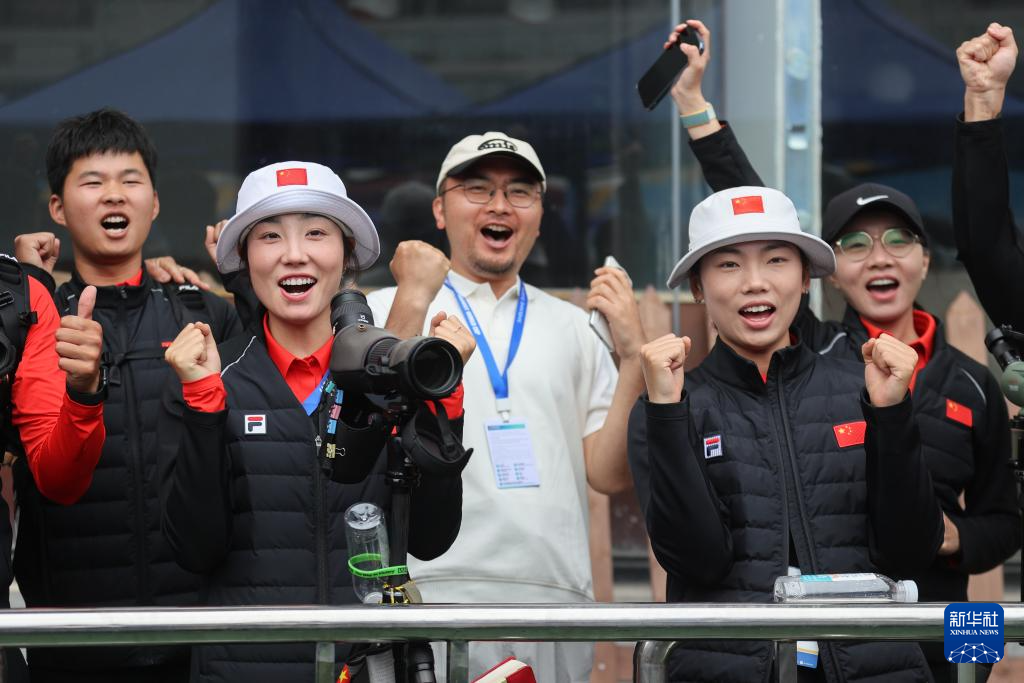 4月26日,队友庆祝李佳蔓晋级女子反曲弓个人赛四强。新华社记者 王翔 摄