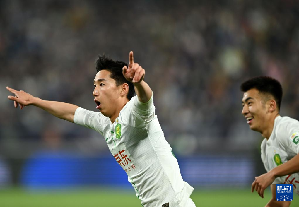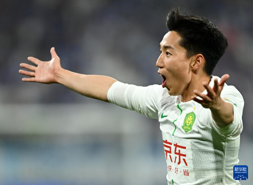 4月30日,北京国安队球员曹永竞在进球后庆祝。新华社记者 赵子硕 摄