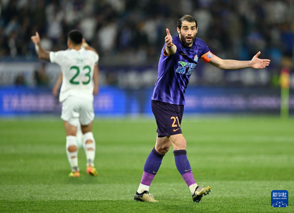 4月30日,天津津门虎队球员什科里奇在比赛中和裁判交流。新华社记者 赵子硕 摄