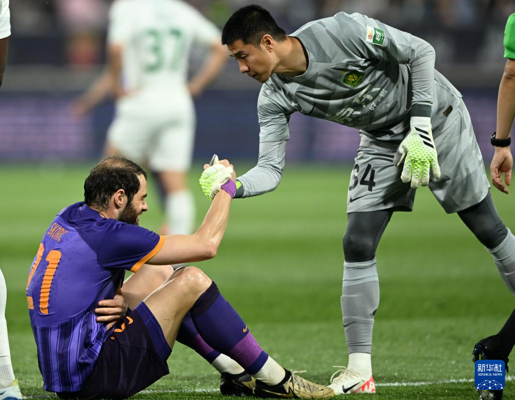 4月30日,北京国安队门将侯森(右)在比赛中扶起天津津门虎队球员什科里奇。新华社记者 赵子硕 摄