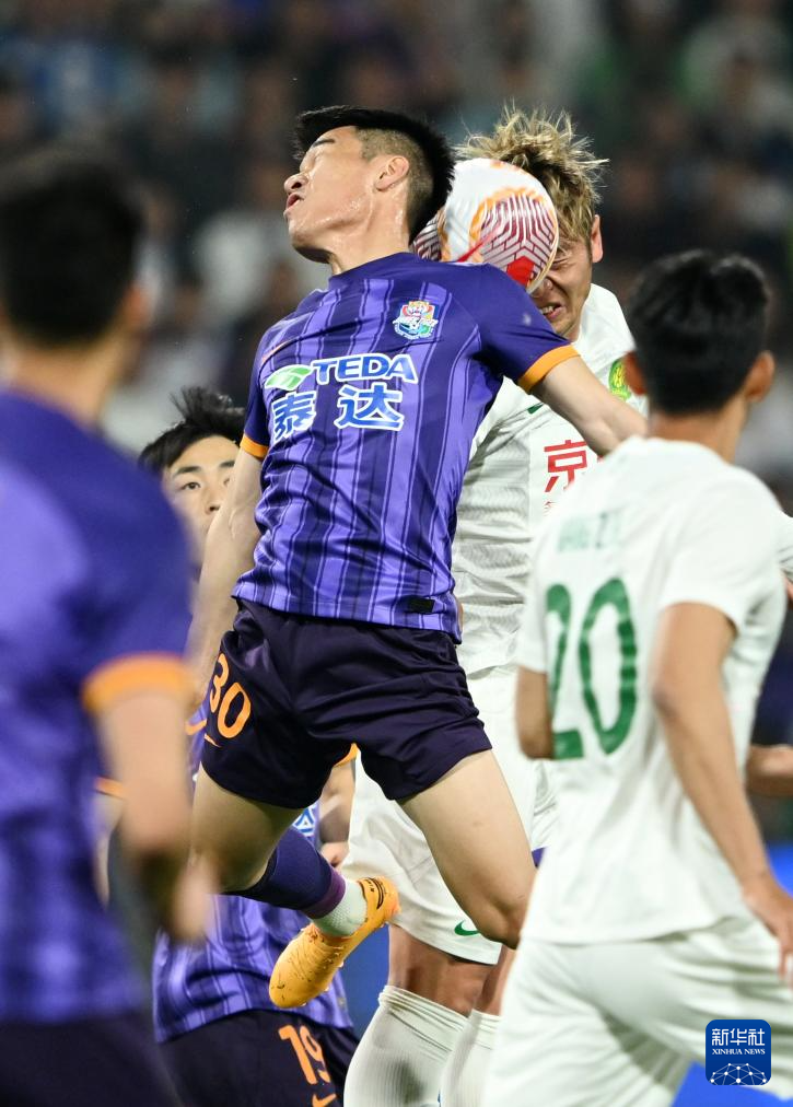4月30日,天津津门虎队球员王秋明(前)和北京国安队球员张稀哲在比赛中争顶。新华社记者 赵子硕 摄