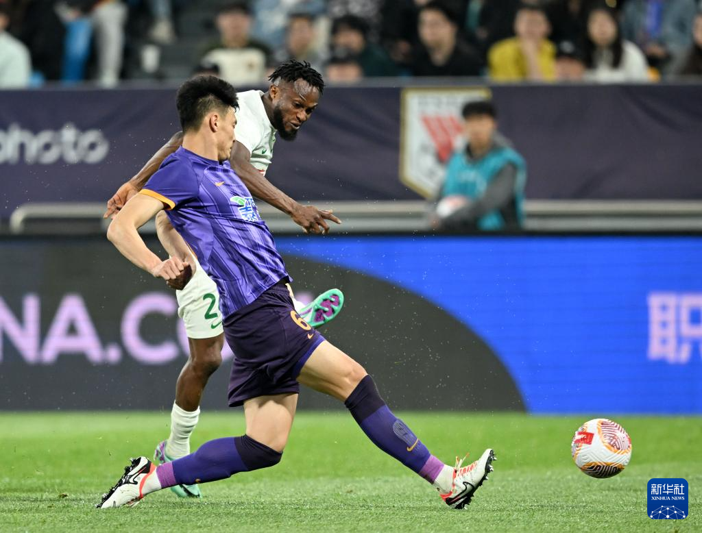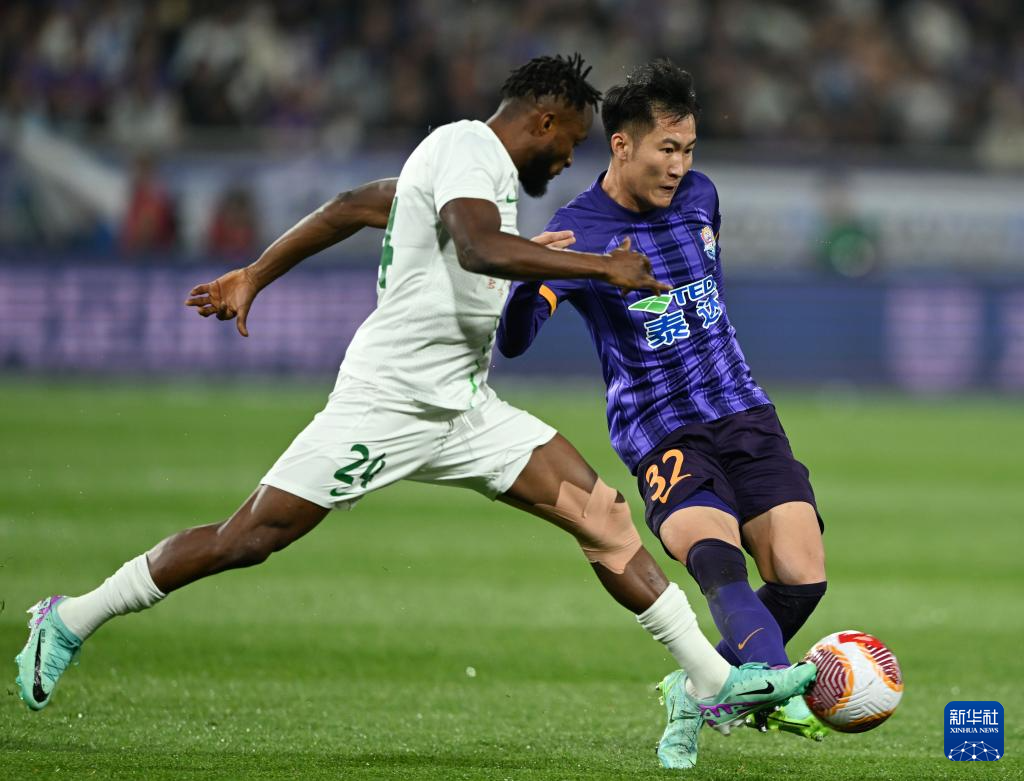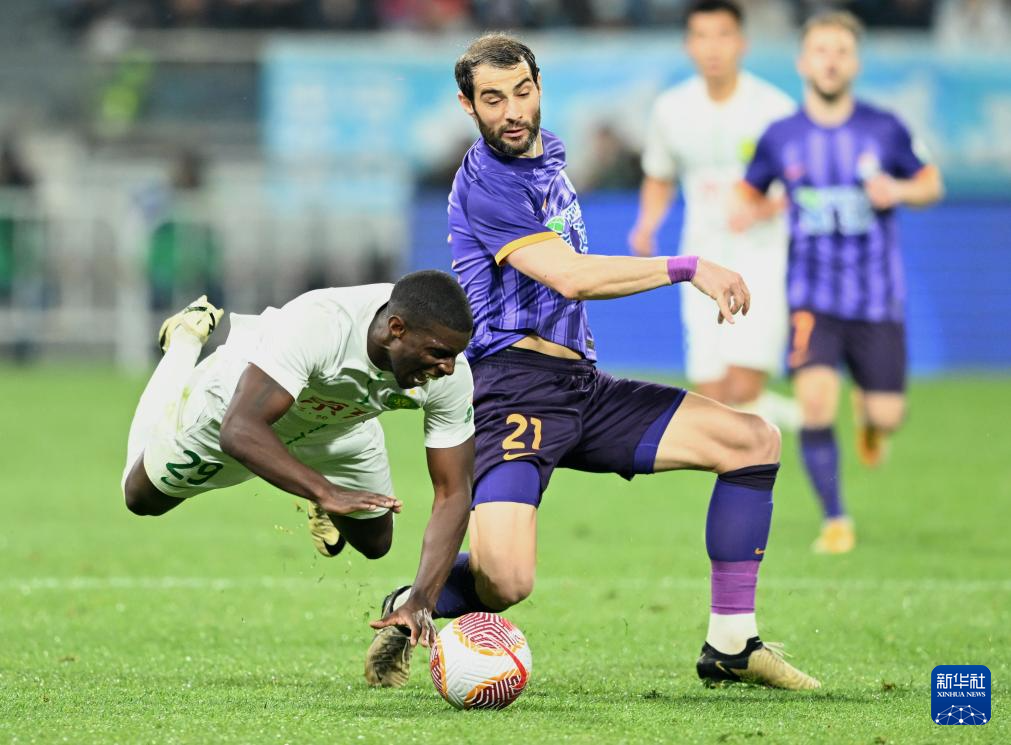 4月30日,天津津门虎队球员韩鹏飞(前)在比赛中防守北京国安队球员阿德本罗。新华社记者 赵子硕 摄