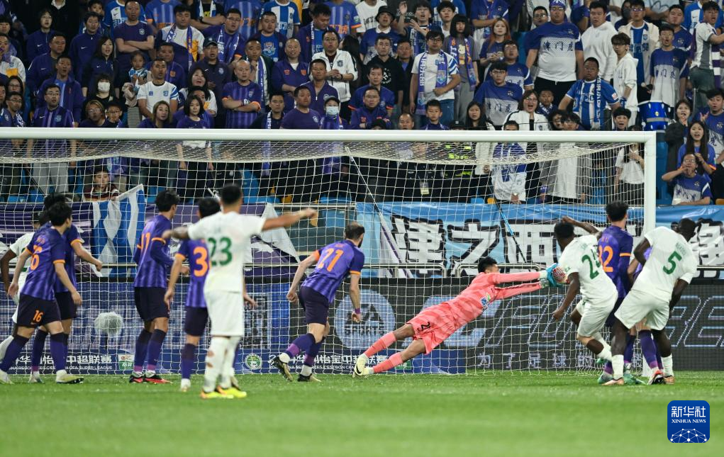 4月30日,天津津门虎队门将方镜淇(右四)在比赛中扑救。新华社记者 赵子硕 摄