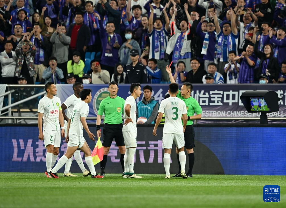 4月30日,主裁判王竞(右一)在比赛中向北京国安队球员张源(右三)出示红牌。新华社记者 赵子硕 摄