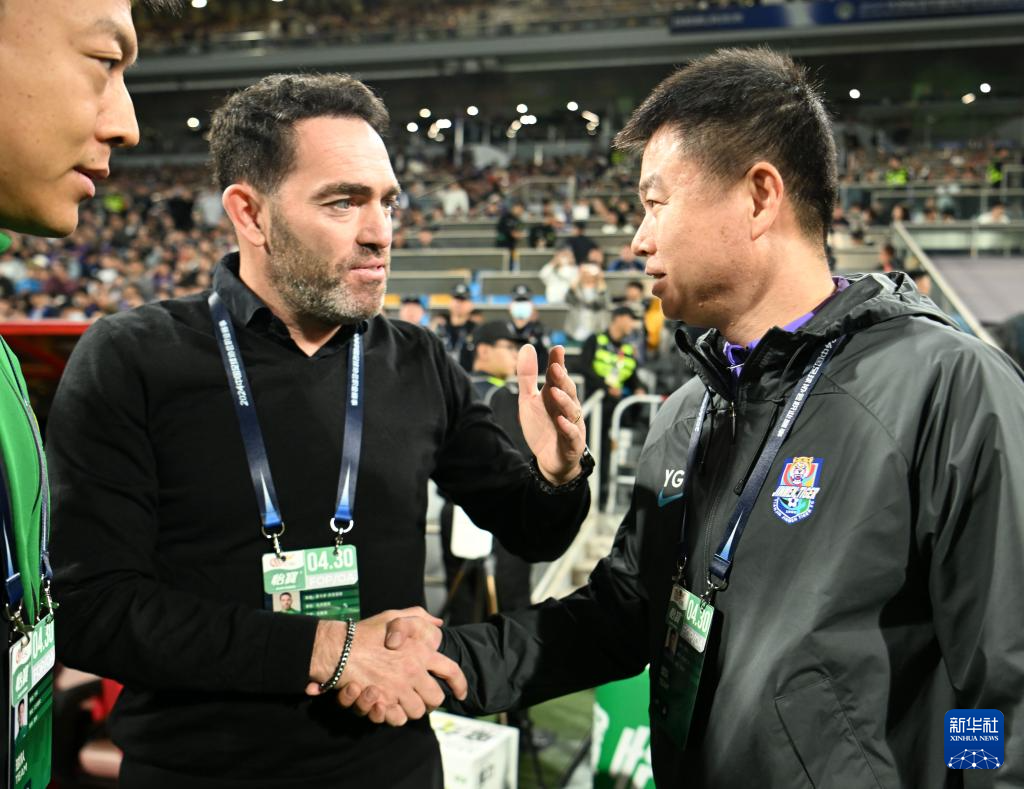 4月30日,天津津门虎队主教练于根伟(右)和北京国安队主教练苏亚雷斯在赛前握手。新华社记者 赵子硕 摄