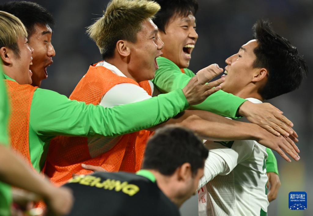 4月30日,北京国安队球员曹永竞(右一)在进球后与队友庆祝。新华社记者 赵子硕 摄