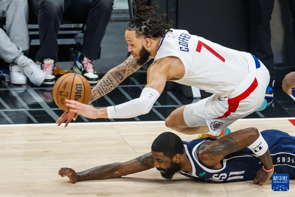 5月1日,快船队球员阿米尔·科菲(上)与独行侠队球员凯里·欧文在比赛中拼抢。新华社发(赵汉荣摄)