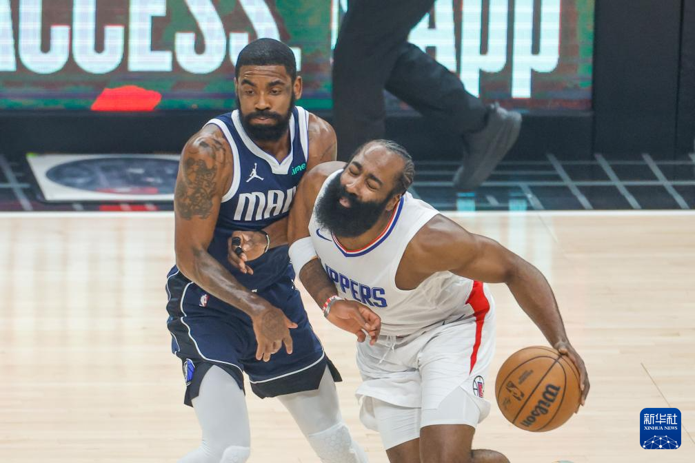 5月1日,快船队球员詹姆斯·哈登(右)在比赛中进攻。新华社发(赵汉荣摄)