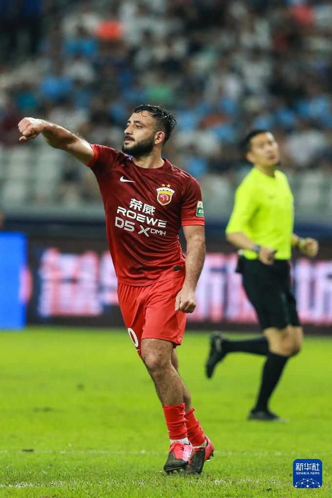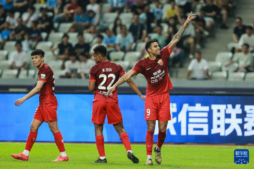 5月5日,上海海港队球员巴尔加斯(前)在比赛中庆祝进球。新华社发(彭志刚摄)