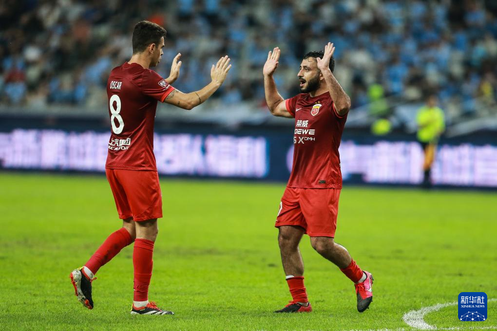 5月5日,上海海港队球员巴尔加斯(右)在比赛中与队友奥斯卡庆祝进球。新华社发(彭志刚摄)