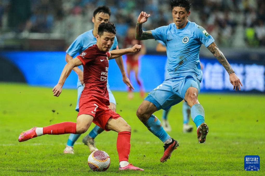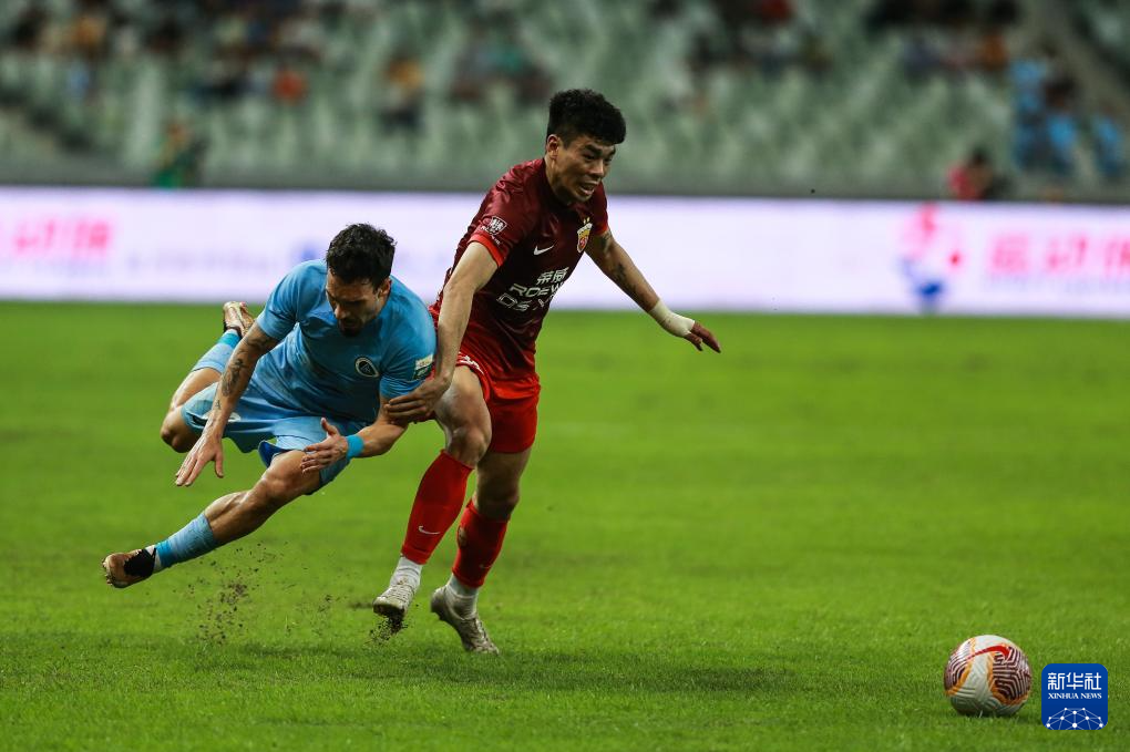 5月5日,深圳新鹏城队球员奥尔蒂斯(左)与上海海港队球员李帅拼抢。新华社发(彭志刚摄)