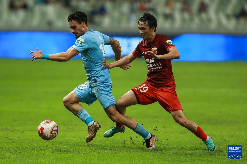 5月5日,上海海港队球员王振澳(右)在比赛中防守深圳新鹏城队球员奥尔蒂斯。新华社发(彭志刚摄)