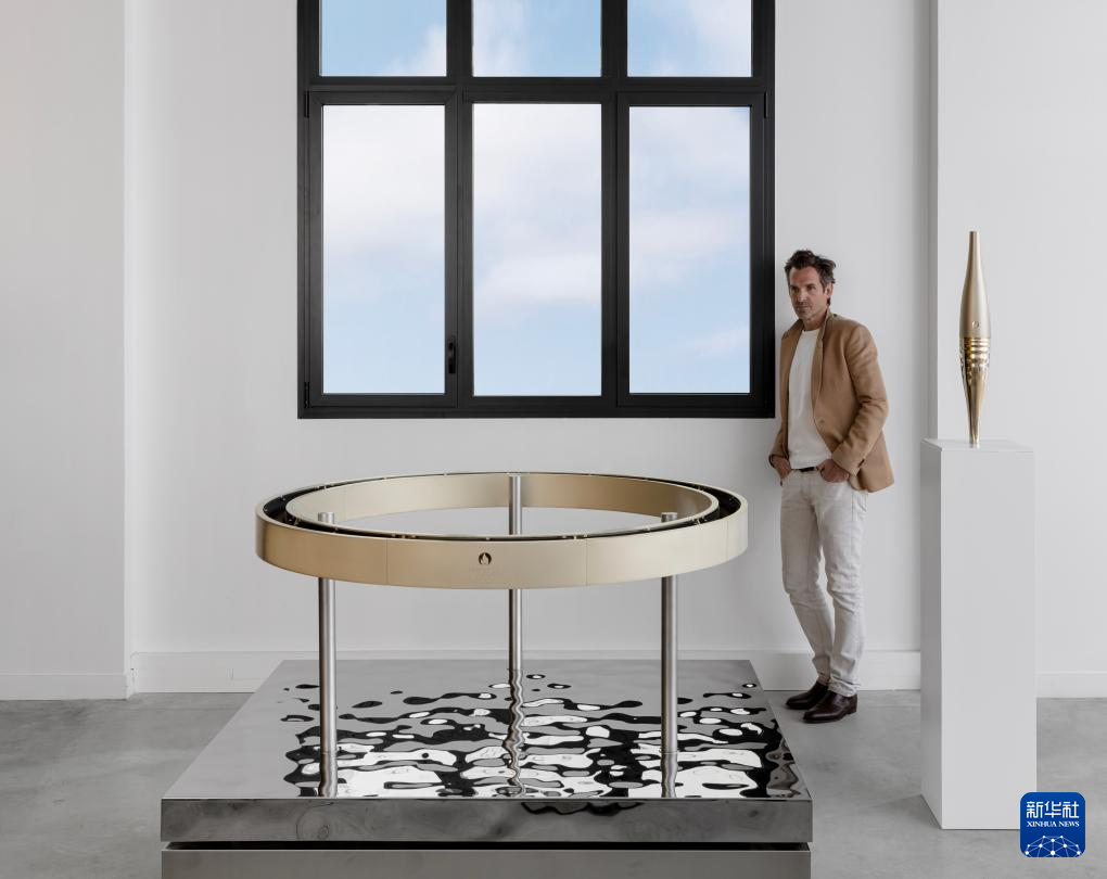 这是设计师马修·勒汉纽尔与火种台合影。新华社发(巴黎奥组委供图)