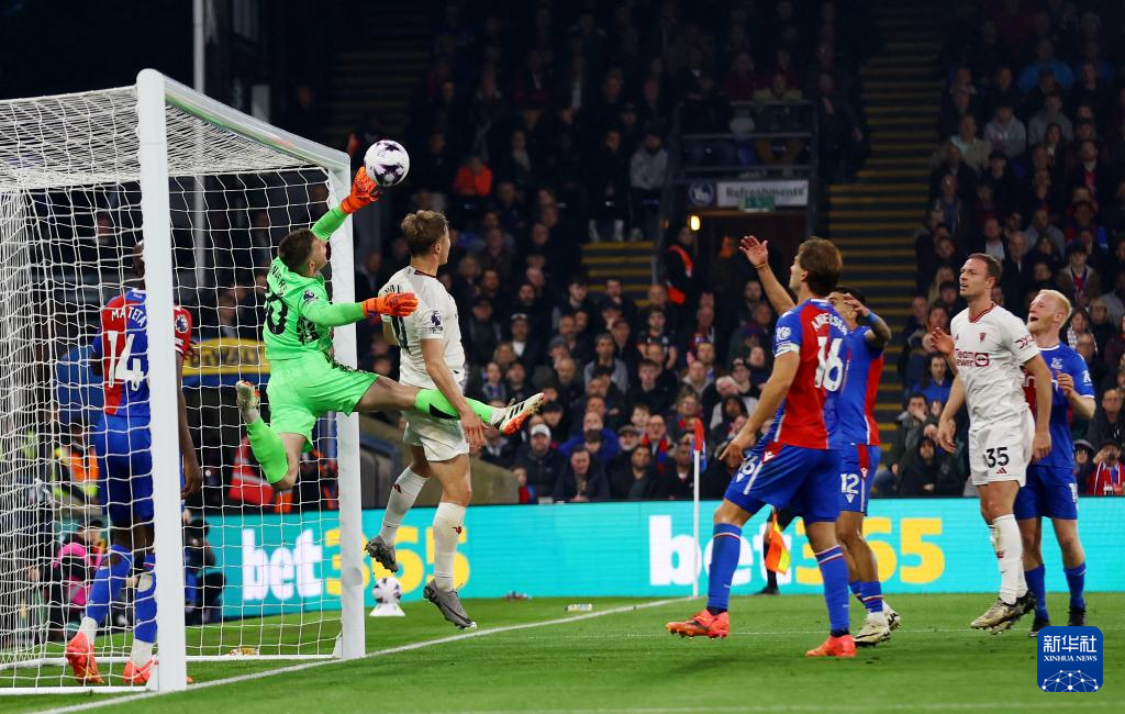 5月6日,水晶宫队守门员亨德森(左二)在比赛中扑救。新华社/路透