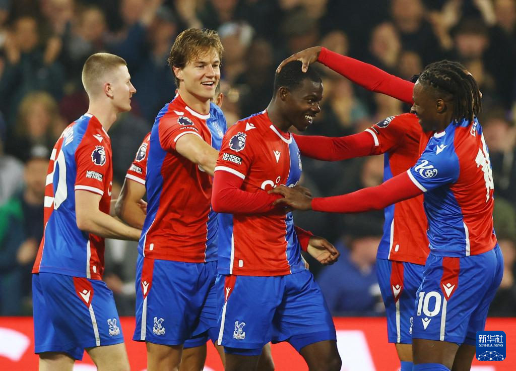 5月6日,水晶宫队球员米切尔(中)打进球队本场第三粒进球后与队友庆祝。新华社/路透