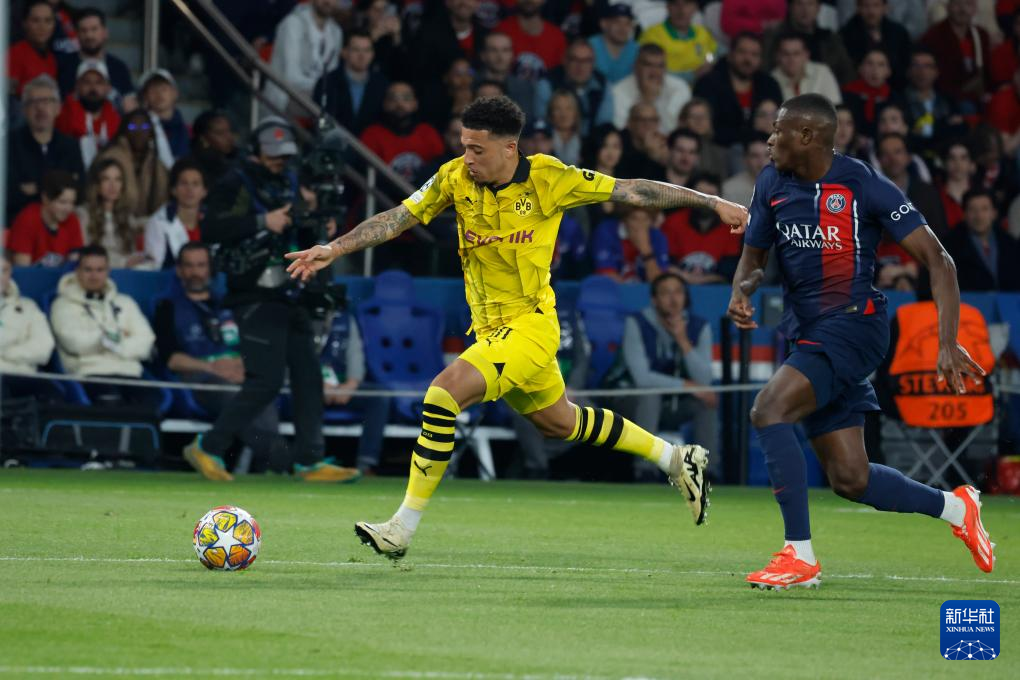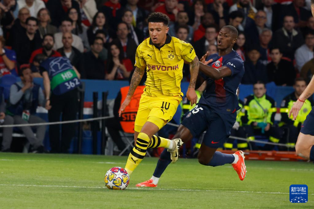 5月7日,巴黎圣日耳曼队球员门德斯(右)与多特蒙德队球员桑乔在比赛中拼抢。新华社发(亨利·斯瓦里克摄)