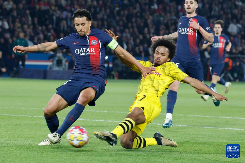 5月7日,巴黎圣日耳曼队球员马尔基尼奥斯(左)与多特蒙德队球员阿德耶米在比赛中拼抢。新华社发(亨利·斯瓦里克摄)
