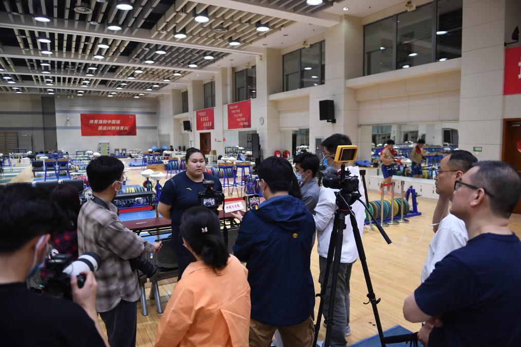 5月10日,国家队选手李雯雯(后)在训练后接受采访。新华社记者 侯昭康 摄
