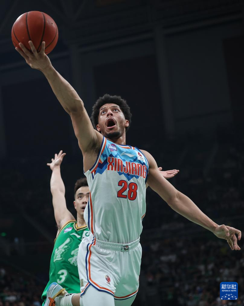 5月15日,新疆伊力特队球员威金顿(前)在比赛中上篮。新华社记者 潘昱龙 摄