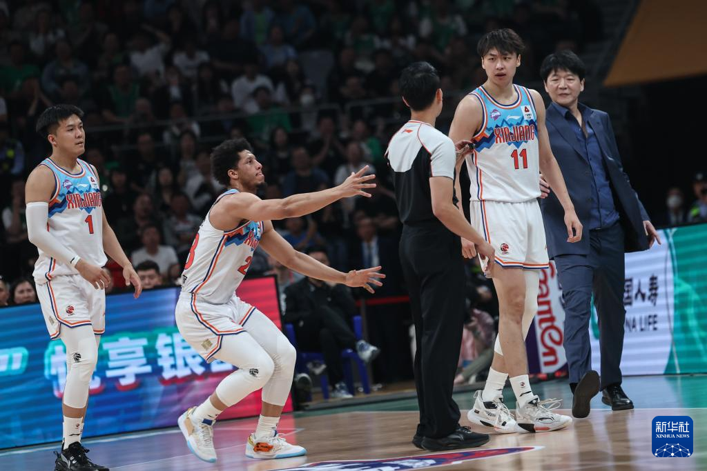 5月15日,新疆伊力特队球员齐麟(右二)在比赛中六次犯规被罚下场。新华社记者 潘昱龙 摄