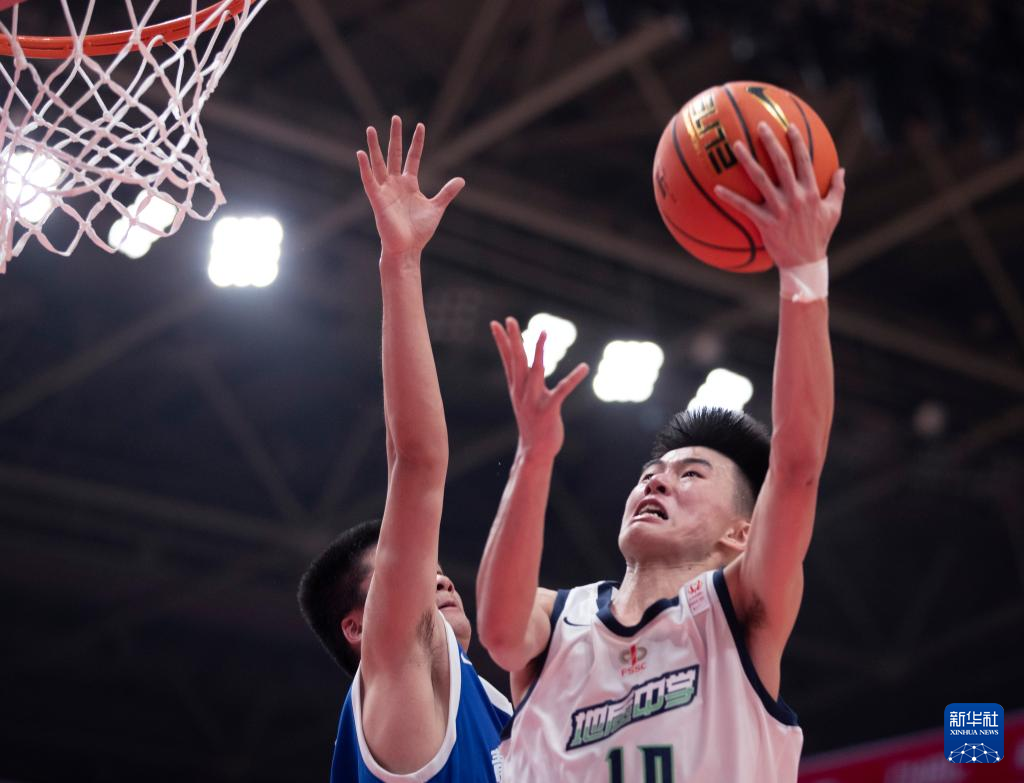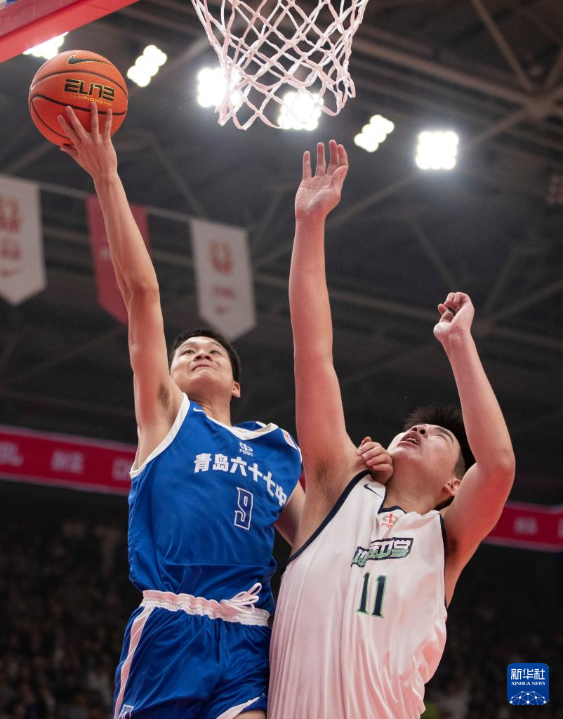 5月19日,青岛六十七中队球员王证(左)在比赛中上篮。新华社记者 雒圆 摄