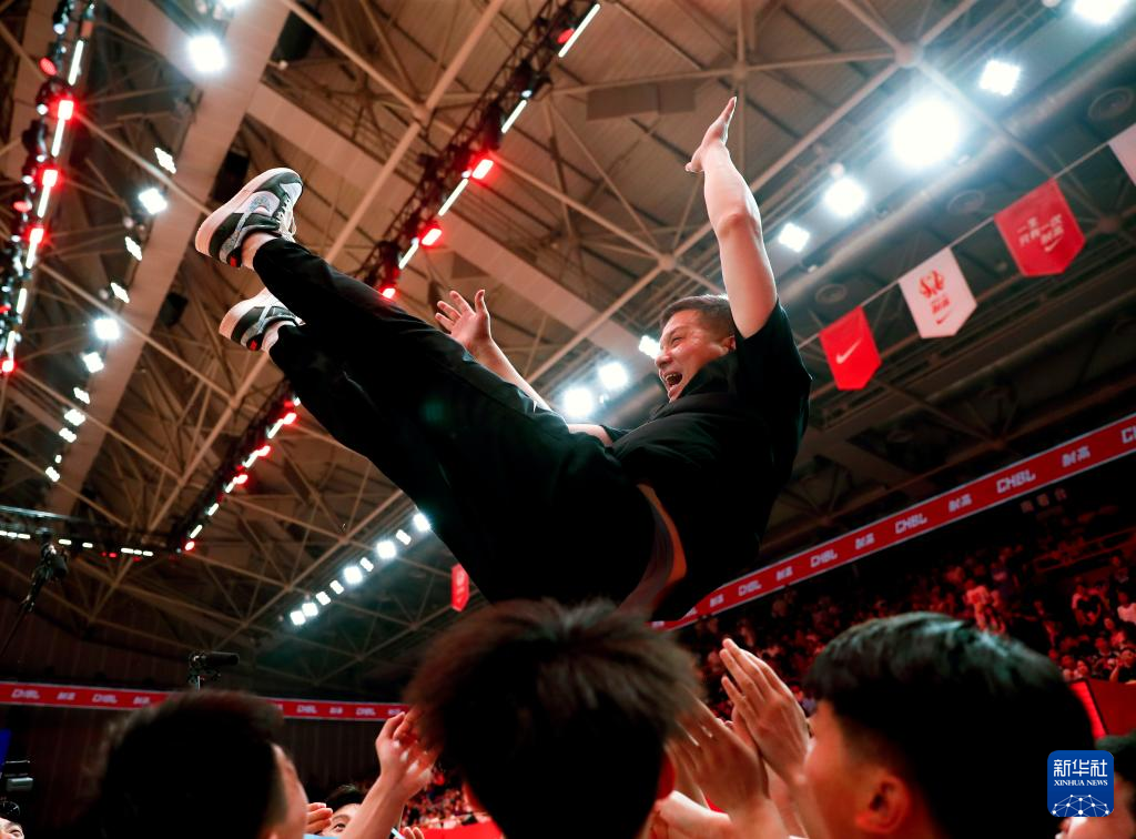 5月19日,湖南地质中学队主教练彭志强(上)被球员抛起庆祝。新华社记者 雒圆 摄