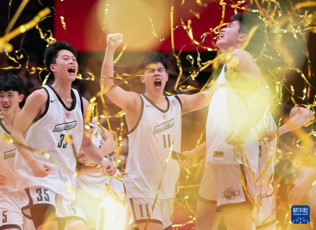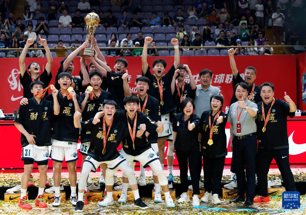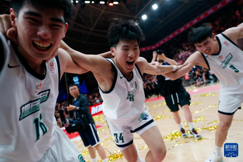 5月19日,湖南地质中学队球员黄滩钧(左)、卢溢廷(中)和王磊庆祝夺冠。新华社记者 雒圆 摄