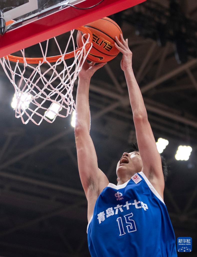5月19日,青岛六十七中队球员王子鉴在比赛中扣篮。新华社记者 雒圆 摄