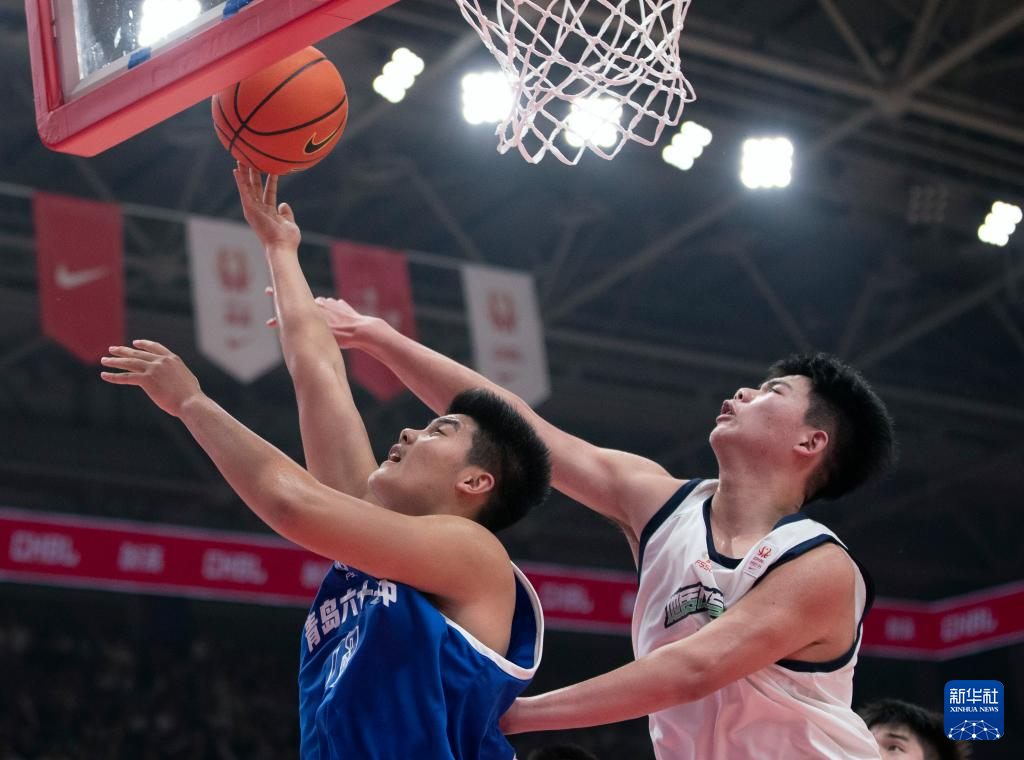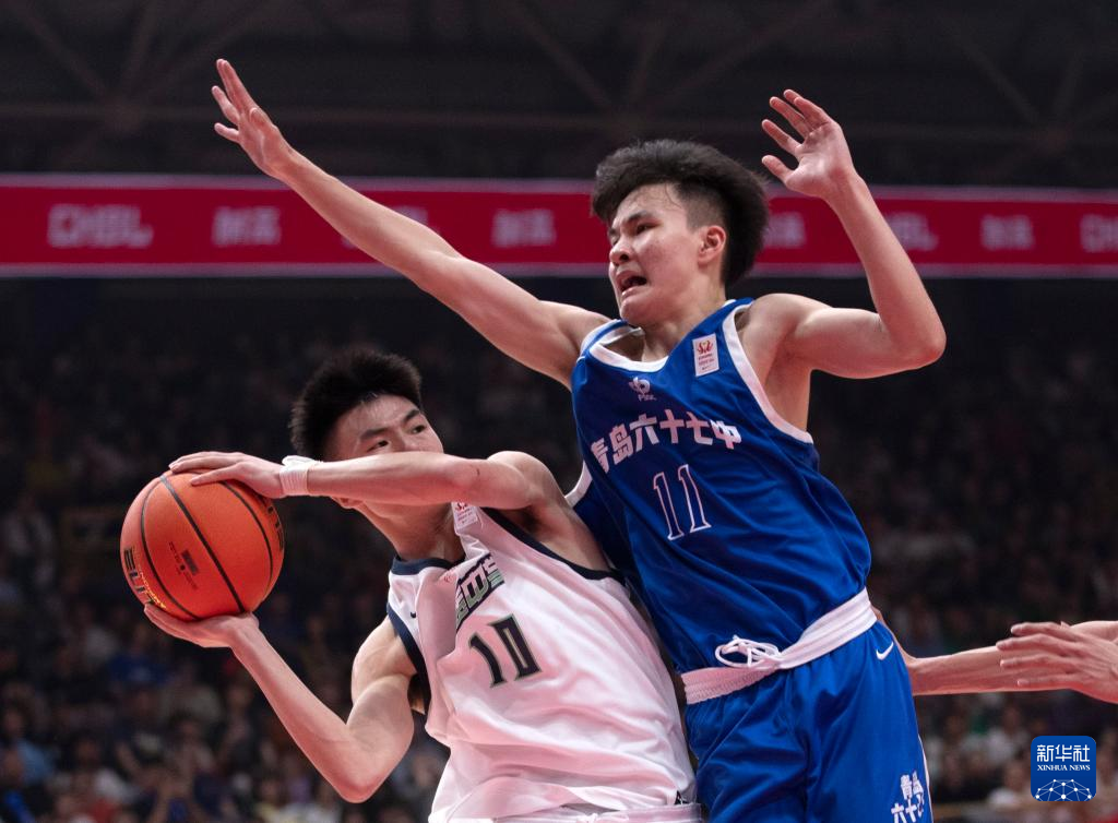 5月19日,湖南地质中学队球员古城安(右)防守青岛六十七中队球员刘盛祥。新华社记者 雒圆 摄