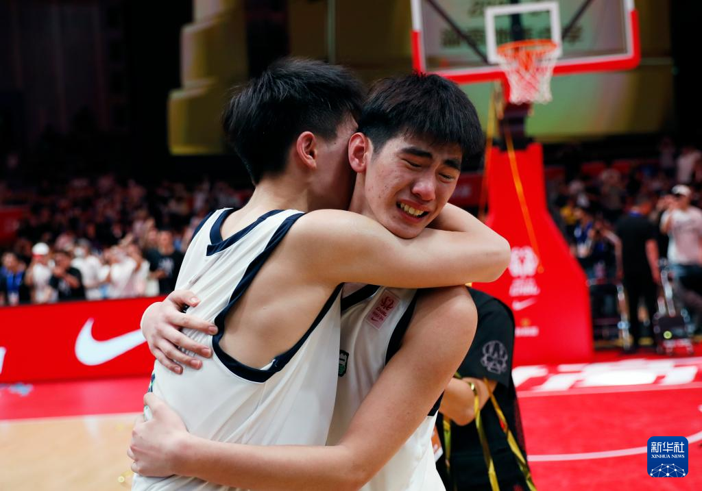 5月19日,湖南地质中学队球员黄滩钧(左)和队友卢溢廷在夺冠后。新华社记者 雒圆 摄