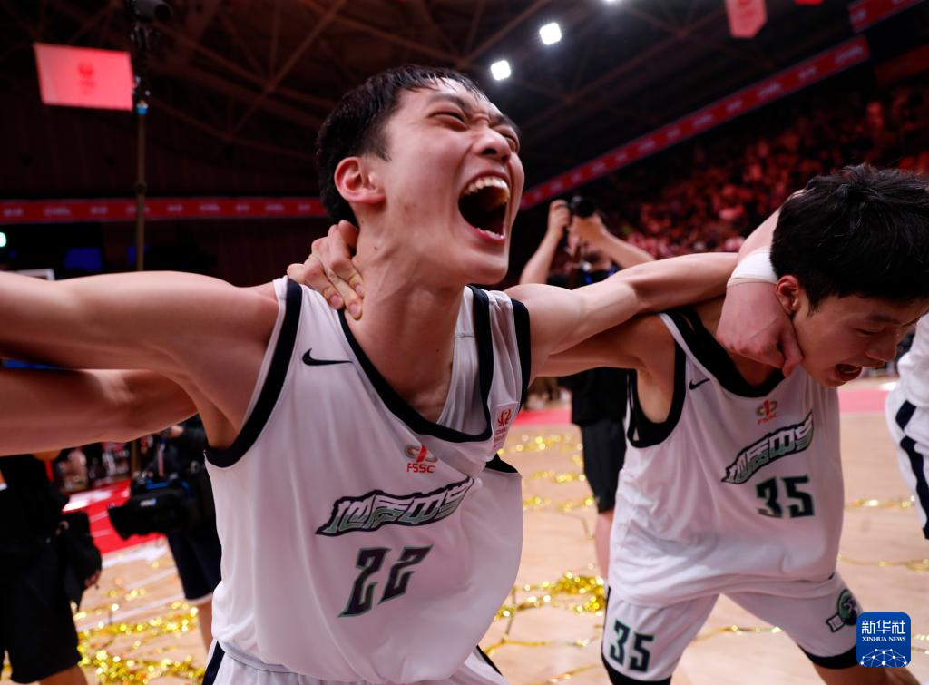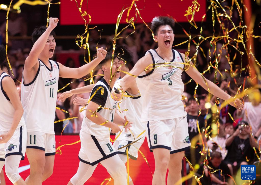 5月19日,湖南地质中学队球员古城安(左一)、王磊(右一)庆祝夺冠。新华社记者 雒圆 摄
