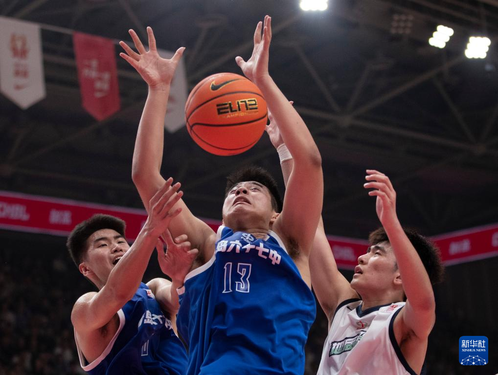 5月19日,青岛六十七中队球员李睿(中)在比赛中抢篮板球。新华社记者 雒圆 摄