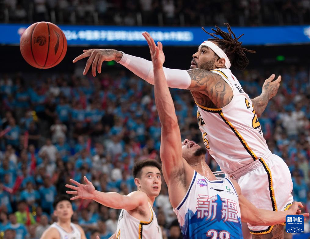 5月20日,新疆伊力特队黄荣奇(左)在比赛中进攻。新华社记者 雒圆 摄