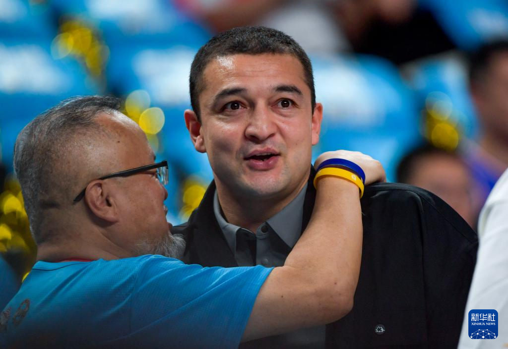 5月20日,南京头排苏酒队球员兼主教练、前新疆伊力特队球员西热力江(右)在比赛前与新疆球迷拥抱。新华社记者 王菲 摄