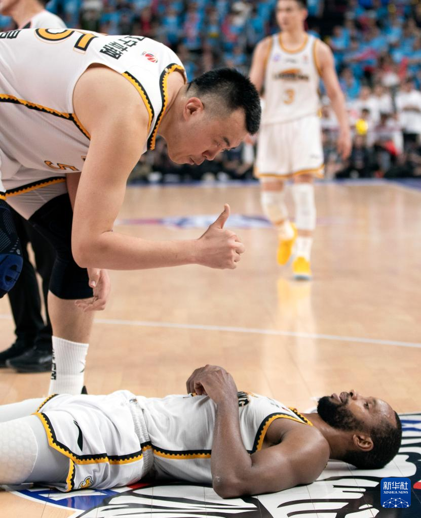 5月20日,辽宁本钢队球员韩德君(上)鼓励因拼抢倒地的队友弗格。新华社记者 雒圆 摄
