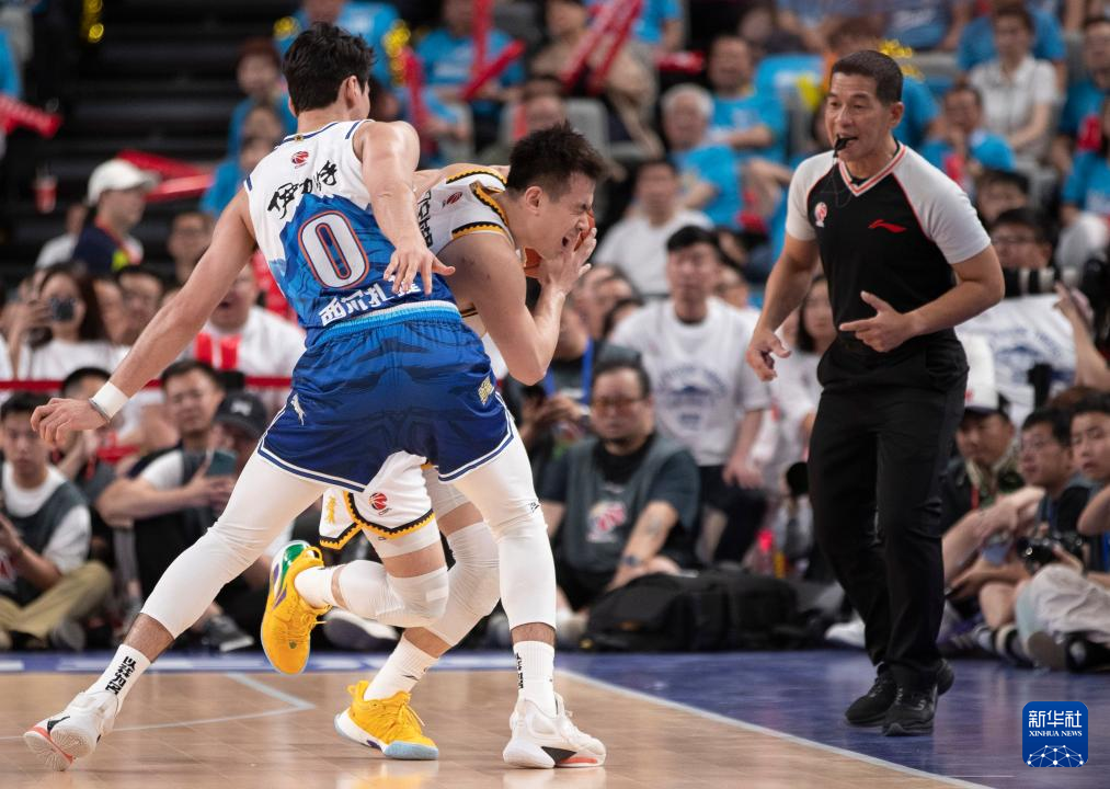 5月20日,新疆伊力特队球员吴冠希(中)和辽宁本钢队球员付豪(右)在比赛中。新华社记者 雒圆 摄