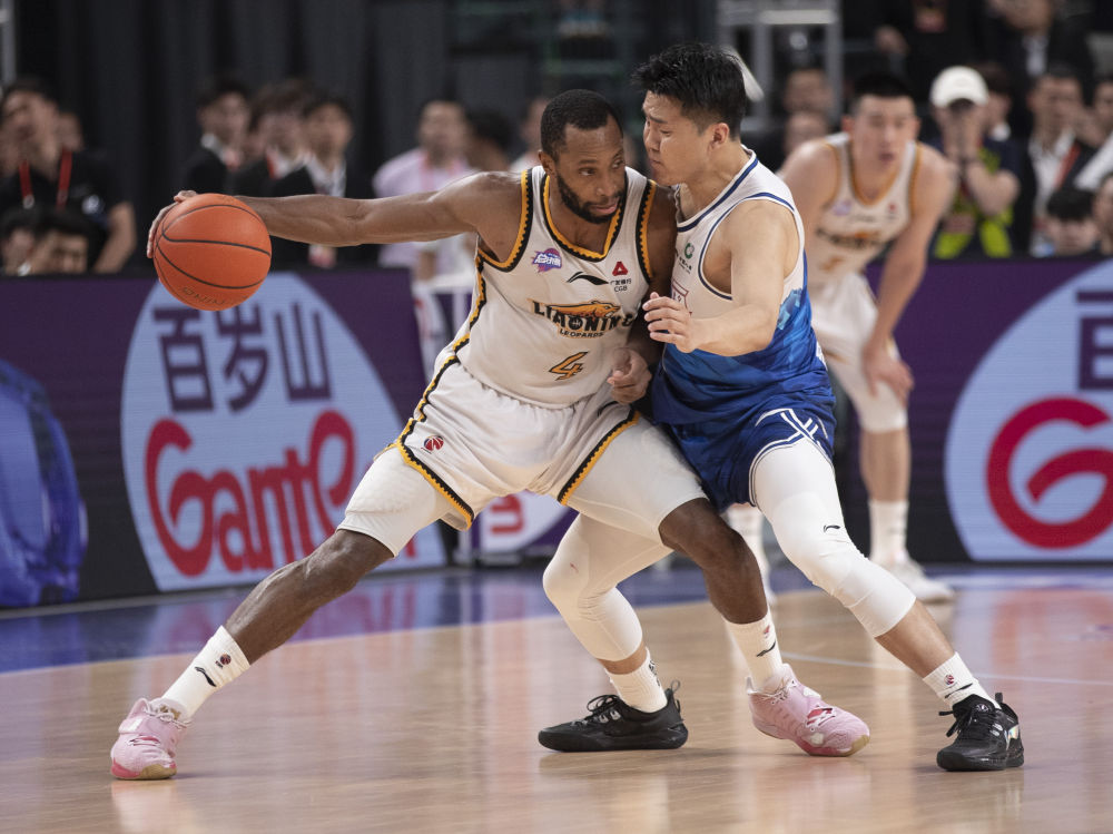 5月20日,辽宁队弗格(左)在比赛中面对新疆队黄荣奇的防守。新华社记者 雒圆 摄